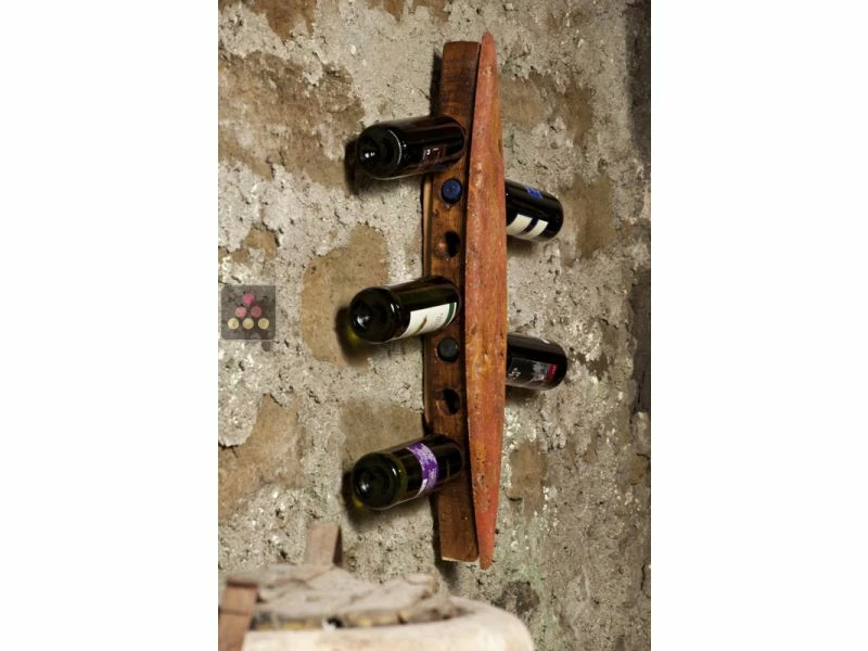 Support mural en bois et pierre naturelle, d’une capacité de 6 bouteilles.