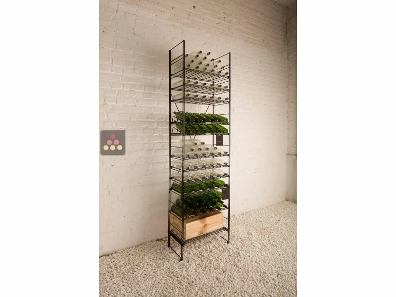 Dans cette configuration de base, ce meuble est prévu pour un stockage des bouteilles empilées, ce qui permet d’atteindre la capacité maximale. Cependant, l’équipement est entièrement personnalisable. Il est ainsi possible d’ajouter tout type de clayettes, soit pour améliorer l’accessibilité aux bouteilles (stockage individuel des bouteilles, clayette coulissante), soit pour obtenir un rendu plus esthétique (tablette inclinée, porte-flamme). Voir les “Accessoires conseillés” pour la liste complète.