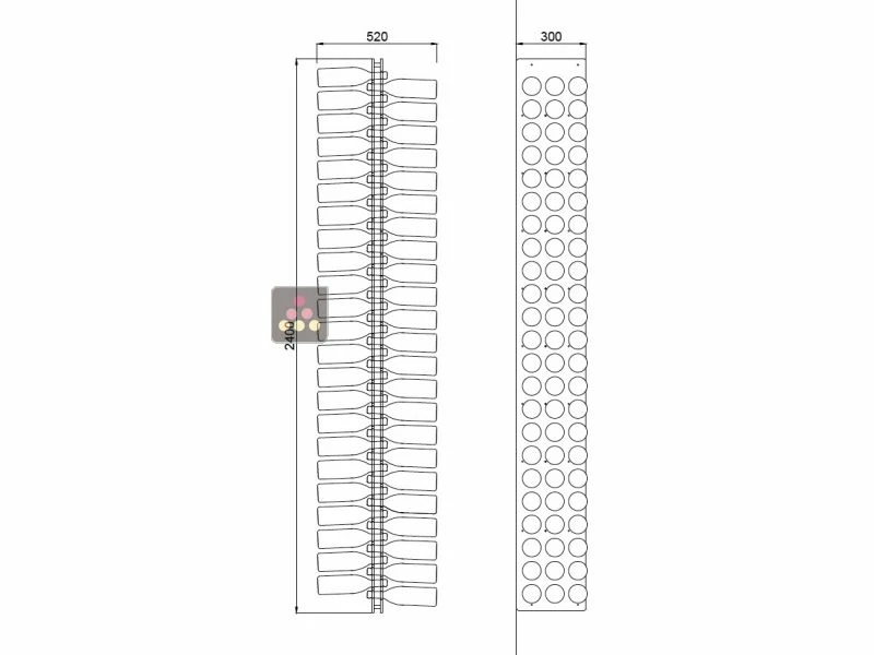 Conçu de façon semi-artisanale, gage de qualité, ce support mural en plexiglas se fixe au mur ou au plafond pour ranger jusqu’à 138 bouteilles de type Bordeaux ou Bourgogne. L’avantage de ce produit est sa très grande capacité puisque les bouteilles sont empilées sur trois niveaux.