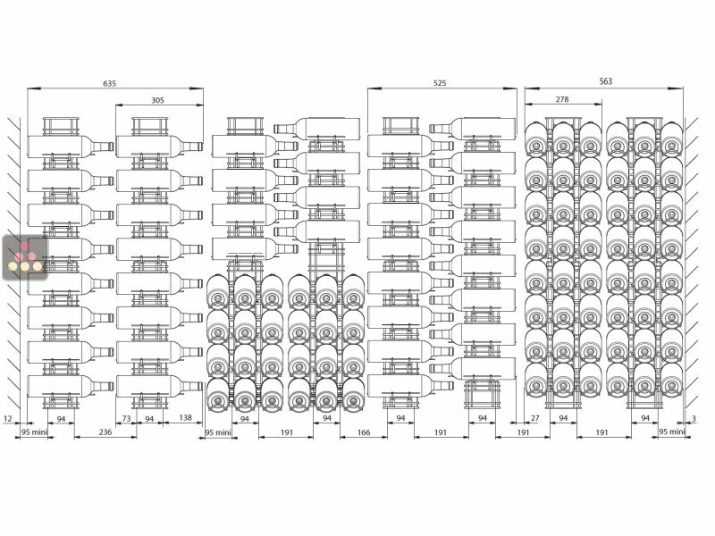 Le produit comprend 12 paniers chromés de 3 empreintes pour bouteilles de 75cl, 4 paniers pour bouteilles horizontales, 8 paniers pour bouteilles inclinées.